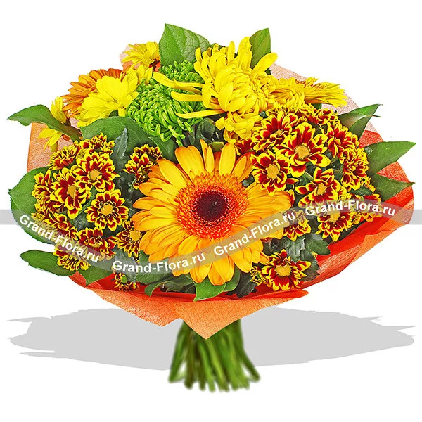 ЛЮКС: гербера оранжевая - 5 шт., хризантема желтая одноголовая - 2 шт., хризантема зеленая одноголовая - 2 шт., хризантема желтая кустовая - 2 шт., хризантема кустовая оранжевая - 3 шт., салал, оранжевый фетр.