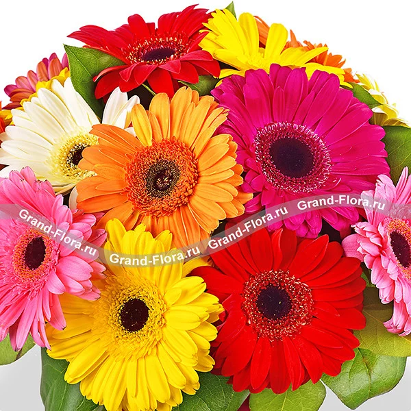 поможет солнечное сочетание пестрых гербер. Нежно розовый цвет намекнет о симпатии, желтый о дружеском интересе, оранжево-красный станет комплиментом, а насыщенно-розовый
